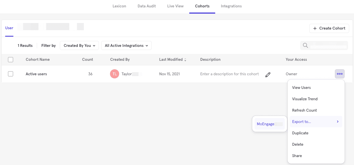 - Select the cohort that you want to export. Click on the three-dot icon on the right side of the cohort and click Export to MoEngage.