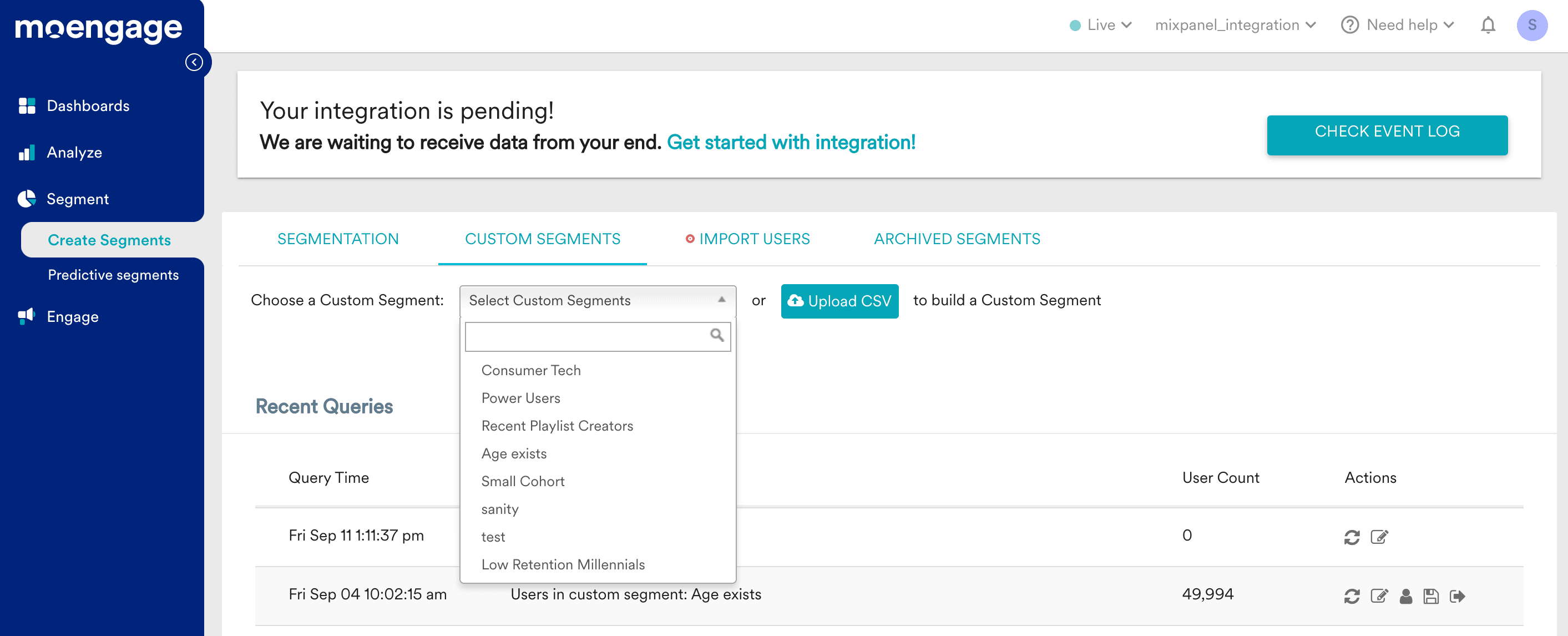 Export Mixpanel cohorts to MoEngage to create custom segments that you can apply in your MoEngage campaigns. Manage the MoEngage integration from the Mixpanel integrations page.