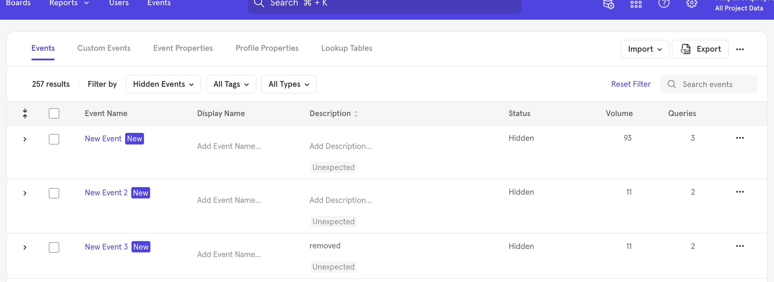 When an admin receives a notification that new events have been ingested, they can click the “View New Events” button, which will take them to a Lexicon view of hidden events. New events will have a “New” tag and be sorted to the top of the list.